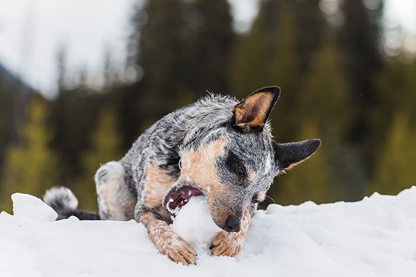 Auch wenn einige Hunde nicht empfindlich auf Schnee im Magen reagieren, so ist es doch sinnvoll, die Tiere nicht zum Fressen zu animieren – beispielsweise durch ausgedehntes Schneeball werfen oder Suchspiele in der Schneedecke. Denn auch dabei nehmen die Hunde immer etwas von der kalten Pracht mit auf. Ist Dein Hund gar nicht davon abzubringen, Schnee zu fressen, so kann notfalls ein Maulkorb beim Spaziergang Schutz bieten.